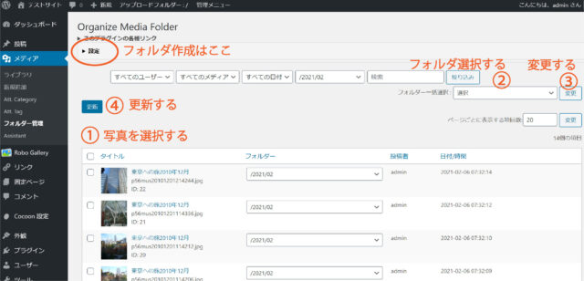 その後移動したいメディアを選択してフォルダを設定して「更新」を押すと移動されます。メディアのリンクも自動的に修正されるので、記事やギャラリーの写真がリンク切れになることはありません。